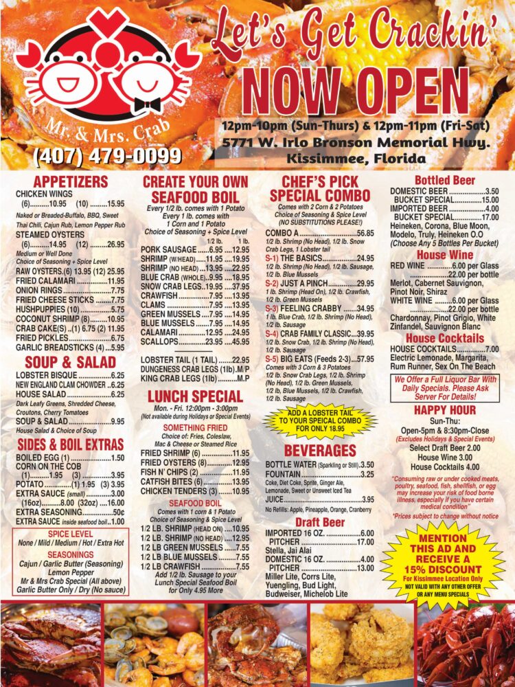 Mr. & Mrs. Crab Listing Category ORIENTAL RESTAURANTS Description Seafood Website https://mmcseafood.com/ Phone 407-479-0099 Address 407-479-0099 ZIP Code 34746