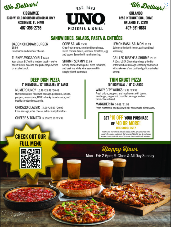 Uno Pizzeria & Grill Listing Category RESTAURANTS Description Uno Pizzeria & Grill Website https://restaurants.unos.com/locations/Kissimmee/FL/0964/ Phone 407-396-2755 Address 5350 W Irlo Bronson Memorial Hwy, Kissimmee, FL ZIP Code 34746