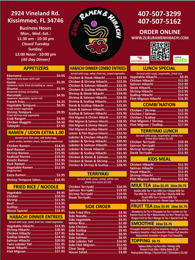 Zuru Ramen & Hibachi Listing Category RESTAURANTS Description Zuru Ramen & Hibachi Website http://www.zururamenhibachi.com Phone 407-507-3299 Address 2924 Vineland Rd. Kissimmee, FL ZIP Code 34746